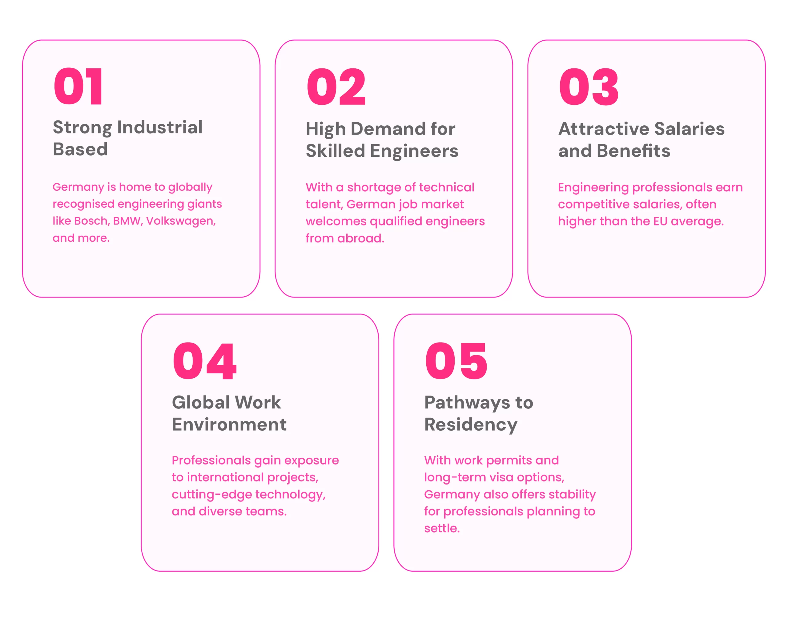 Mechanical and automative engineering lead in demand due to Germany’s strong industrial base. However, IT, renewable energy, and electrical engineering are also rapidly growing. Offering excellent opportunities for skilled professionals across different engineering specialisations.
