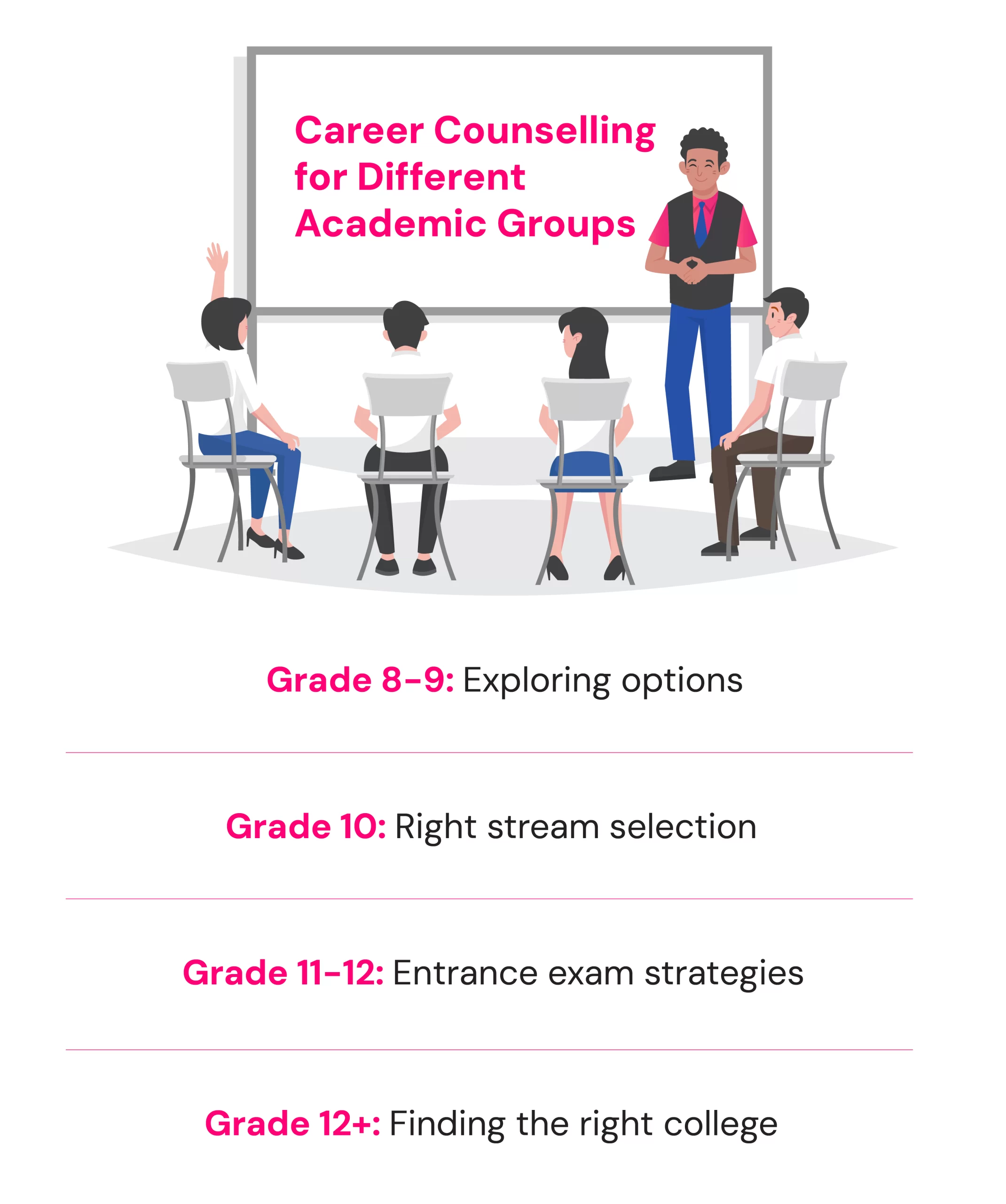 The right age for career counselling is from Grade 8th onwards, when students begin exploring subjects. Early guidance helps them align interests with academics, build future-ready skills, and make confident choices without last-minute confusion or peer pressure.